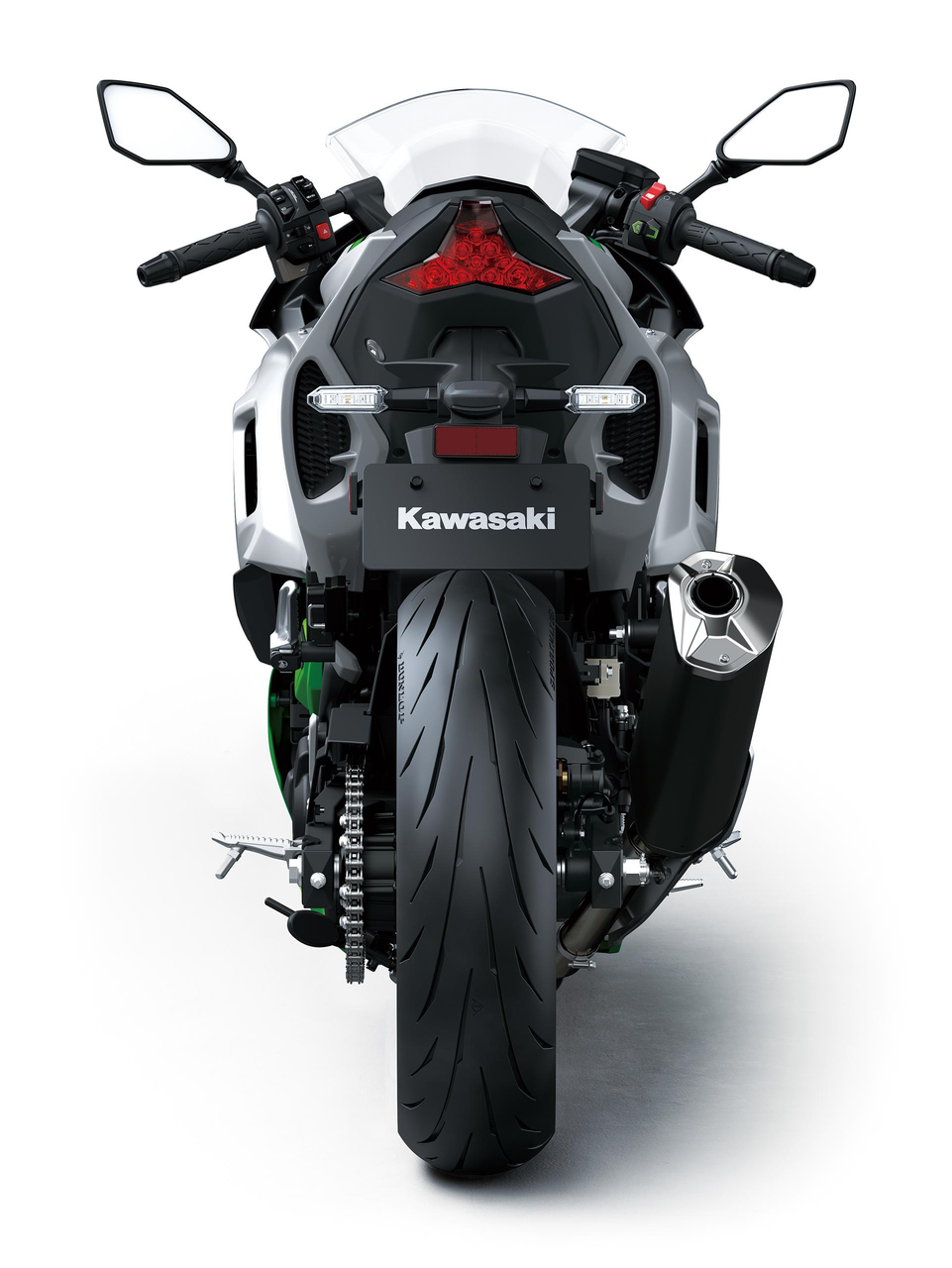 Zusätzlich zu der Gesamtleistung auf dem Niveau einer Maschine der 650-ccm-Klasse, kann die Ninja 7 Hybrid mit aktiviertem E-Boost unter bestimmten Bedingungen eine Ninja ZX-10R aus dem Stand heraus beschleunigen.