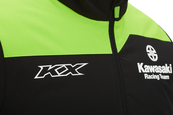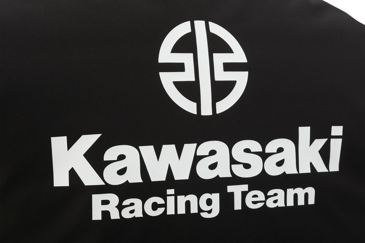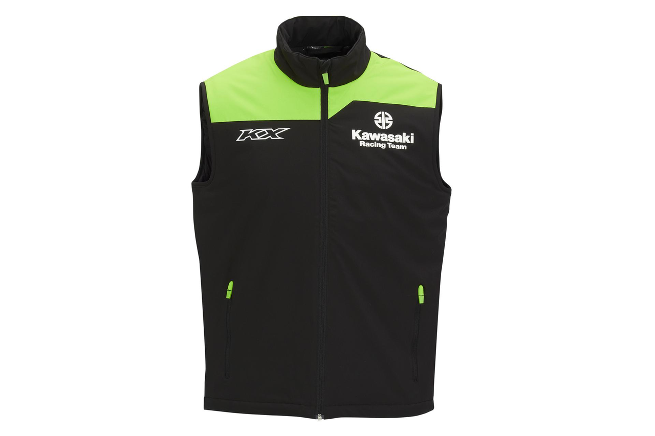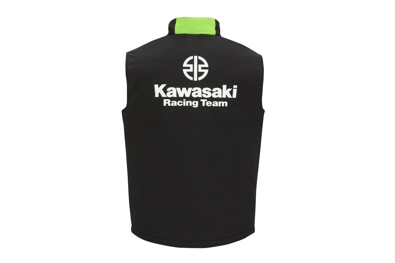 Wasserdichte Stepp-Weste mit Reißverschluss-Taschen innen und außen • Versiegelte Nähte • Horizontal gesteppte Thermofütterung • Außentaschen und innere Brusttaschen mit Reißverschluss • Kawasaki Racing- und Sponsor-Logos • 96% Polyester, 4% Elastan