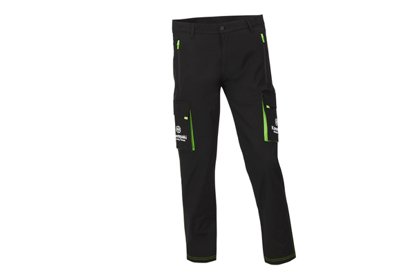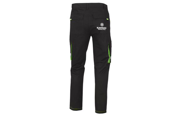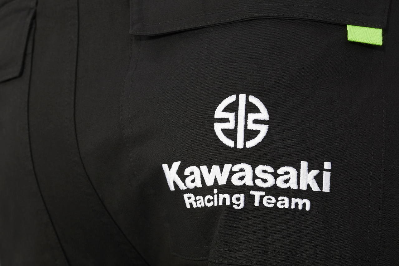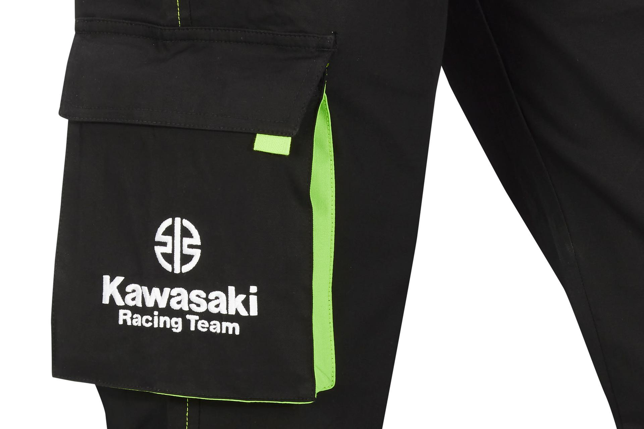 Lange Hose im Cargo-Stil • Reißverschlusstaschen vorne • Cargo-Taschen an den Seitenbeinen • Gesäßtasche mit Klappen • Kawasaki Racing-Logos • Mittelgewichtiger Stoff • Material: 97% Baumwolle, 3% Elastan
