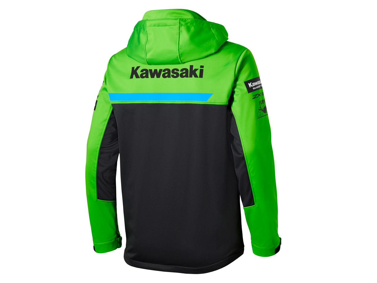 Softshell jacket in Kawasaki WSBK team colours. It has zipped outer pockets and adjustable cuffs. Extended size range with x-small to accommodate unisex fit.