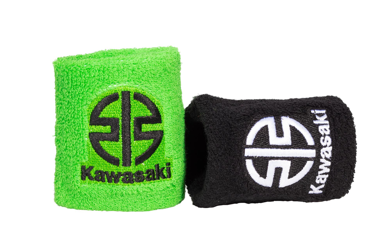 Set aus grünen und schwarzen Schweißbändern • Mit Kawasaki Rivermark-Logo • Material: 95% Baumwolle, 5% Elastan • Maße: 8 x 8 cm