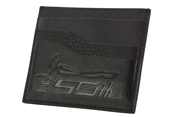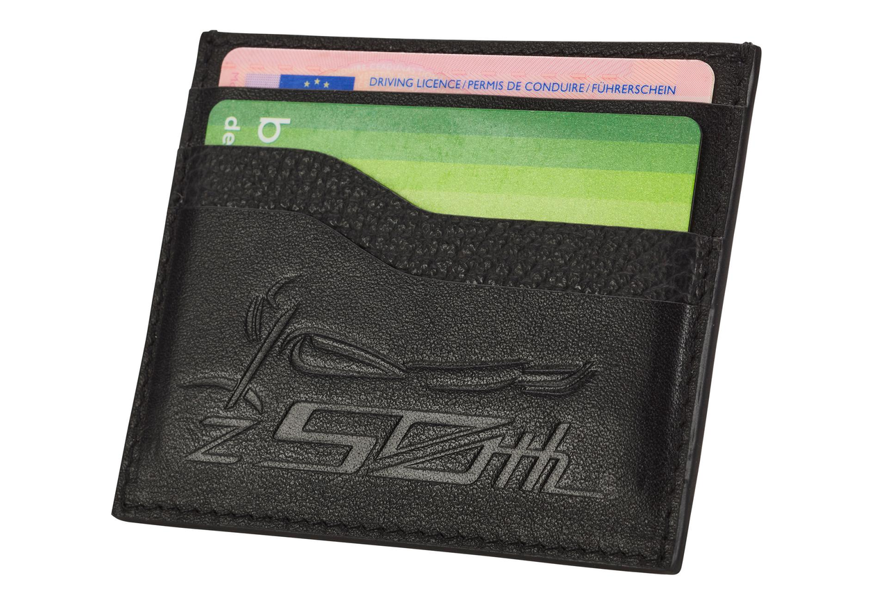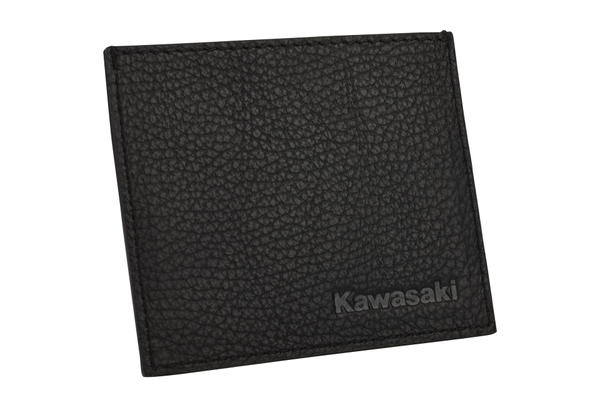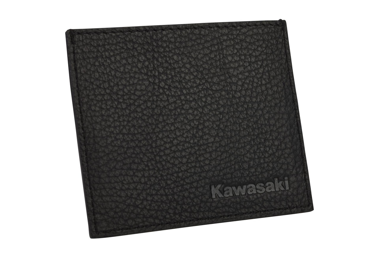 Kompaktes Kreditkarten-Etui, 100% Leder • Logo-Prägungen: 50th Anniversary vorn, Kawasaki hinten • Verschiedene Leder-Texturen hinten / vorn