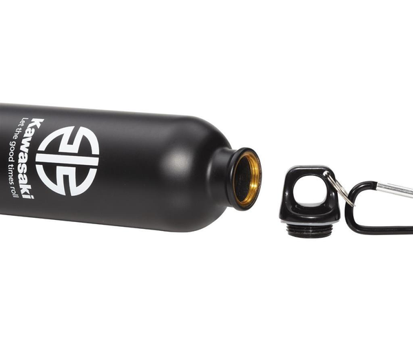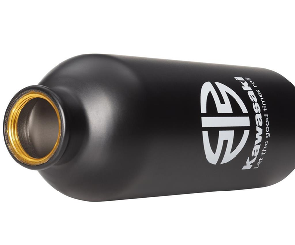 Schwarze Trinkflasche aus Edelstahl mit Kawasaki-Logo und Schraubverschluss und 500ml Fassungsvermögen.