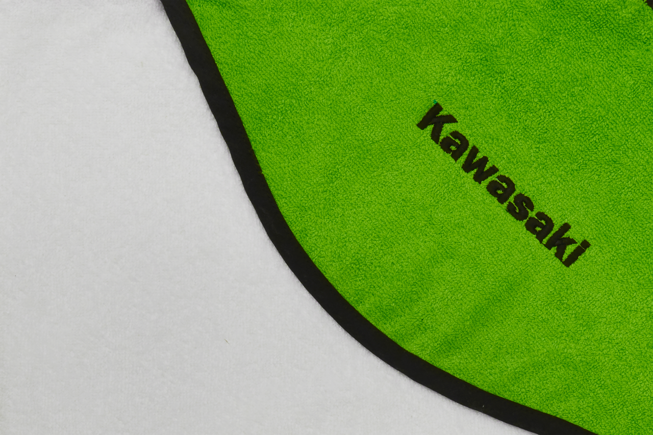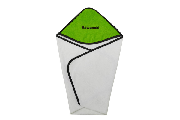 Kawasaki Kapuzenhandtuch • 100 % Frottee für maximalen Badespaß • Weißes Handtuch • Größe: 75 cm x 75 cm • Schwarzer Saum • Kapuze in Kawasaki-Grün • Mit Kawasaki-Logo • 100 % Baumwolle