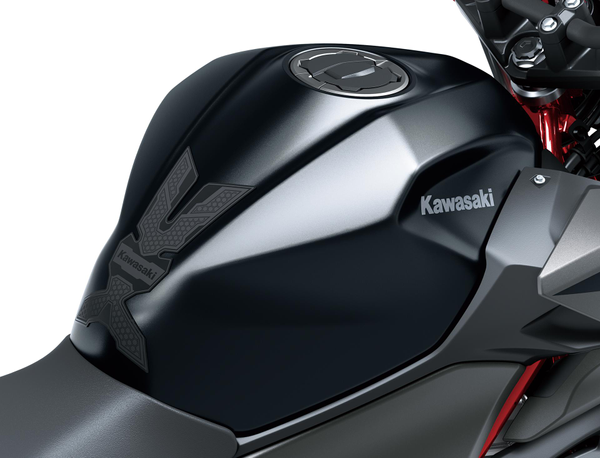 Schwarzes Tankpad mit Kawasaki-Logo für zusätzlichen Schutz vor Kratzern.